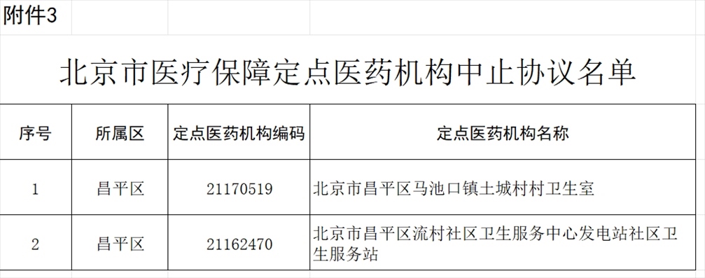 北京市昌平區(qū)馬池口鎮(zhèn)土城村村衛(wèi)生室等2家定點(diǎn)醫(yī)藥機(jī)構(gòu)因不能繼續(xù)為參保人員提供服務(wù),申請中止協(xié)議,經(jīng)市、區(qū)醫(yī)保經(jīng)辦機(jī)構(gòu)審核,現(xiàn)決定對上述2家定點(diǎn)醫(yī)藥機(jī)構(gòu)中止協(xié)議(見附件3)。