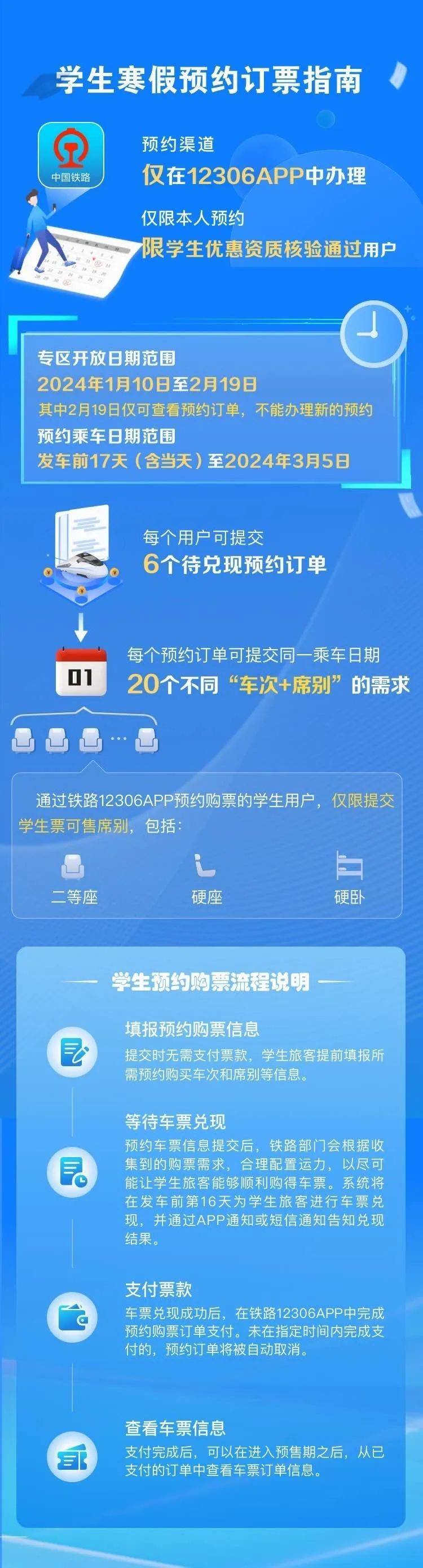 為認(rèn)真貫徹落實黨中央國務(wù)院關(guān)于做好2024年元旦春節(jié)期間有關(guān)工作的要求,保障學(xué)生、務(wù)工人員等重點群體春運出行,鐵路12306創(chuàng)新服務(wù)舉措,為學(xué)生、務(wù)工人員推出了售票服務(wù)專區(qū)。自1月10日起,符合條件的學(xué)生旅客(已通過學(xué)生優(yōu)惠資質(zhì)核驗且有剩余優(yōu)惠乘車次數(shù))可通過“學(xué)生寒假訂票專項服務(wù)”專區(qū)預(yù)約購買春運期間(1月26日至3月5日)火車票,每名旅客最多可同時提交6個預(yù)約訂單,每個訂單可添加1個乘車日期的20個“車次+席別”的組合,可選席別為學(xué)生優(yōu)惠票適用的硬座、硬臥、二等座。已通過實名制核驗的務(wù)工人員可通過“務(wù)工人員春運預(yù)約訂票服務(wù)”專區(qū)預(yù)約購買春運期間火車票,每名旅客可同時提交6個預(yù)約訂單,每個訂單可選擇“時間+車次+席別”的1個組合。