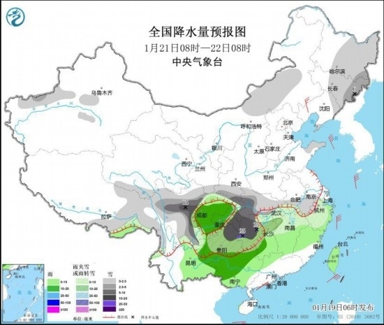 中新網(wǎng)1月19日電 據(jù)中央氣象臺(tái)網(wǎng)站消息,昨日內(nèi)蒙古、陜西、河南等地出現(xiàn)小到中雪或雨夾雪,湖南、湖北、江西等地部分地區(qū)出現(xiàn)明顯降雨。19日,內(nèi)蒙古等地有雨雪天氣,廣西、湖南、江西等地有明顯降雨,防范對(duì)交通運(yùn)輸?shù)鹊挠绊懀?0日起寒潮影響我國(guó)中東部,關(guān)注大風(fēng)降溫和雨雪天氣對(duì)交通運(yùn)輸、城市運(yùn)行和農(nóng)業(yè)生產(chǎn)等的影響。