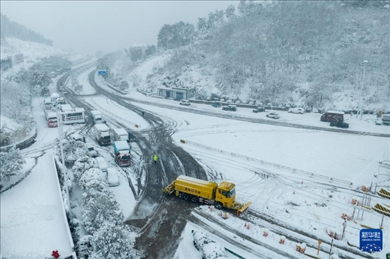 1月22日,在湖南省婁底市一高速收費站,除雪車在作業(yè)(無人機照片)。近日,受寒潮天氣影響,我國多地迎來降溫降雪天氣,各地積極組織相關(guān)部門開展抗凝除雪工作,保安全保暢通。新華社發(fā)(吳永華攝)