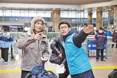 春運(yùn)首日,北京西站內(nèi),中國鐵路北京局志愿者為旅客進(jìn)行引導(dǎo)。本報(bào)記者 張武軍攝