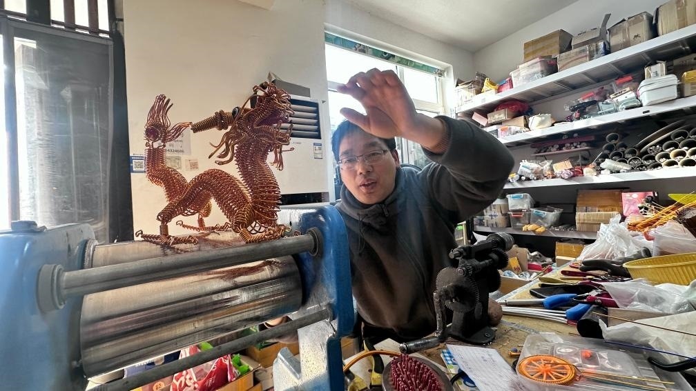在村民楊訓政不大的鋁編工作室內,簡易貨架上一排排銅色鋁線編制成的藝術品讓人目不暇接。一條條鋁制彈簧經過村民巧妙處理后,成了工藝品市場的搶手貨:發(fā)財樹、恐龍、摩托車、機器人……“我這鋁編雖然產量低、規(guī)模小,訂單可已經排到了今年10月底。龍年將至,來自海內外的訂單讓大家年前忙得不亦樂乎。”楊訓政一邊用鉗子擺弄著鋁編小龍,一邊告訴記者。