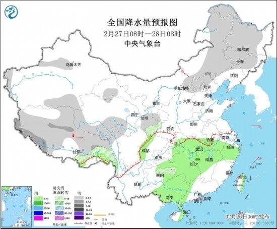 全國降水量預(yù)報圖(2月26日08時-27日08時)