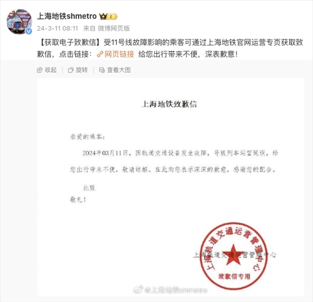 上海地鐵11號線因車輛故障限速運行預計晚點15分鐘以上,官方致歉