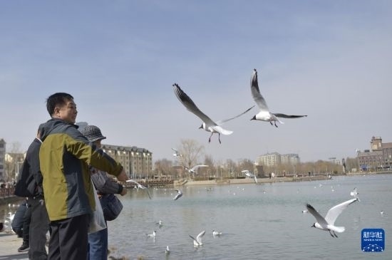 春日里,不少紅嘴鷗飛經(jīng)寧夏銀川,在湖泊濕地休整覓食,吸引市民前來(lái)觀賞投喂。