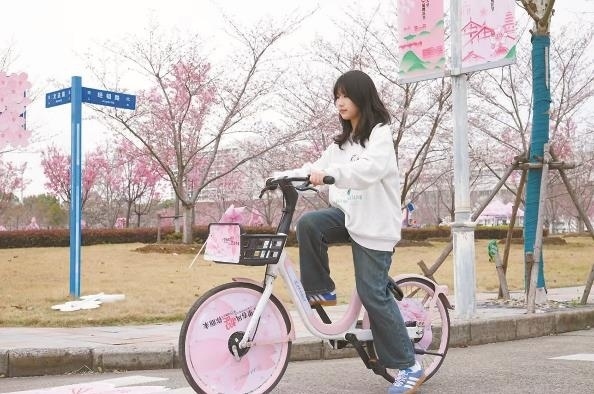 櫻花節(jié)期間,學(xué)校是禁止機動車入校的。校園大,游人累了怎么辦?上經(jīng)貿(mào)大學(xué)生食堂門口便出現(xiàn)了一道亮麗的風(fēng)景線:那就是學(xué)校和“哈啰單車”聯(lián)名的粉色共享單車。50輛粉色的單車整齊排放在廣場上,車頭的粉色風(fēng)車迎風(fēng)轉(zhuǎn)動,櫻花節(jié)專屬IP“貿(mào)小櫻”人偶,揮舞著雙手邀請師生們前來騎行。聯(lián)名活動設(shè)計了賞櫻打卡點,游客可以騎著櫻花單車游覽校園,在3個最佳賞櫻點拍照打卡,體驗各處櫻花的詩情畫意。
