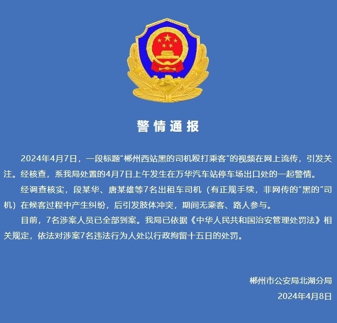 央視網(wǎng)消息:據(jù)“北湖公安局”公眾號消息,4月7日,一段標(biāo)題“郴州西站黑的司機(jī)毆打乘客”的視頻在網(wǎng)上流傳,引發(fā)關(guān)注。經(jīng)核查,系該局處置的4月7日上午發(fā)生在萬華汽車站停車場出口處的一起警情。