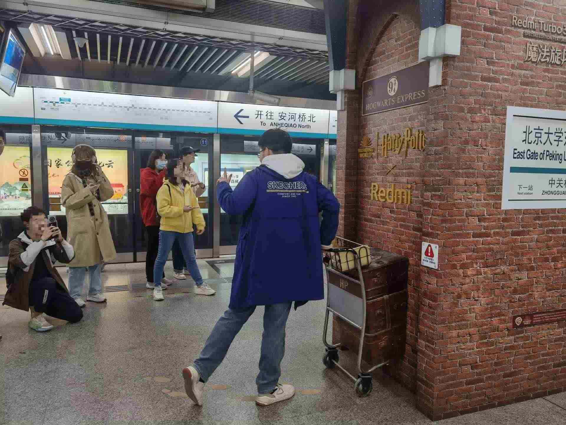 北京大學(xué)東門地鐵站內(nèi),眾多市民打卡拍照哈利·波特站臺