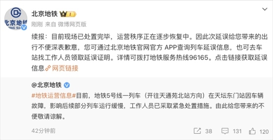 央視網(wǎng)消息:據(jù)@北京地鐵 微博消息,目前現(xiàn)場已處置完畢,運(yùn)營秩序正在逐步恢復(fù)中。此前,北京地鐵發(fā)文稱,地鐵5號(hào)線一列車(開往天通苑北站方向)在天壇東門站因車輛故障,影響后續(xù)部分列車運(yùn)行緩慢,工作人員已采取緊急處置措施。