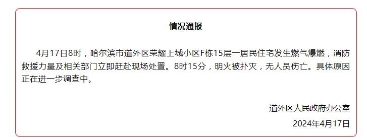 央視網(wǎng)消息:據(jù)“記憶道外”官微消息,哈爾濱市道外區(qū)人民政府辦公室發(fā)布情況通報(bào),4月17日8時(shí),哈爾濱市道外區(qū)榮耀上城小區(qū)F棟15層一居民住宅發(fā)生燃?xì)獗迹谰仍α考跋嚓P(guān)部門立即趕赴現(xiàn)場(chǎng)處置。8時(shí)15分,明火被撲滅,無人員傷亡。具體原因正在進(jìn)一步調(diào)查中。