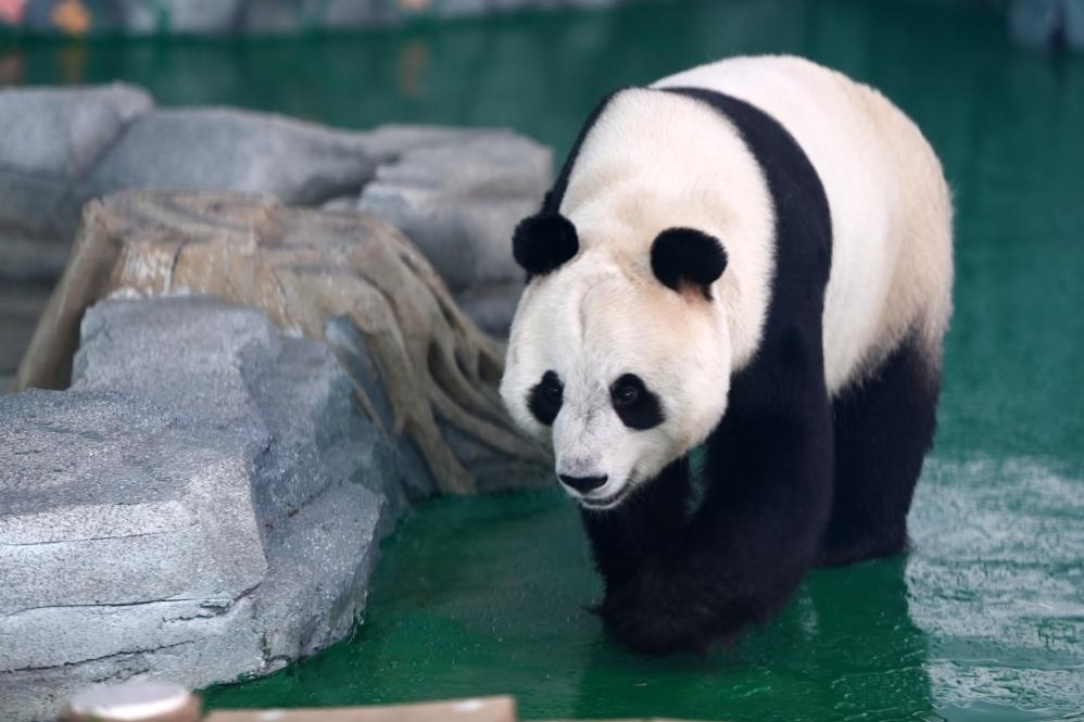繼續(xù)前行進入大熊貓2號館,便能看到園內(nèi)唯一的雌性大熊貓“曼蘭”。今年7歲的它“兩耳不聞窗外事”,疾步快走,不停地在館舍內(nèi)繞圈子。住在它隔壁的6歲雄性大熊貓“滿滿”則鏡頭感十足,當游客拿出手機拍攝時,它趴在地上吐舌頭“賣萌”,不一會又變換姿勢,攀上木樁玩耍,吸引眾多游客紛紛按下快門,記錄它活潑可愛的一面。