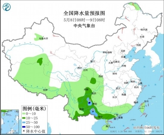 5月8日08時至9日08時,四川盆地東南部、重慶西部、貴州西部、云南東部、廣西西部和南部、廣東南部等地部分地區(qū)有中到大雨,其中,貴州西南部局地有暴雨(50~90毫米)。內蒙古中東部、黑龍江西北部、吉林西部、遼寧大部、新疆南疆盆地和東部等地部分地區(qū)有4~6級風。東海東北部海域、臺灣海峽、巴士海峽、南海東北部海域將有5~6級、陣風7級的風。