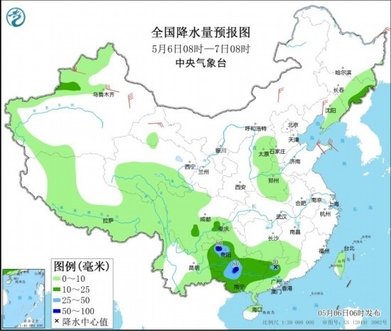 全國降水量預報圖(5月6日08時-7日08時)