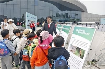 玉環(huán)法院綜合審判庭干警在漩門灣國家濕地公園,向小學生講解普法展板。