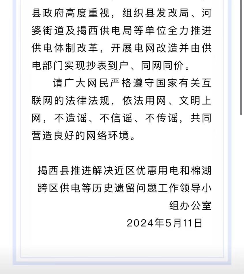 針對(duì)此事,“揭西發(fā)布”微信公眾號(hào)于5月12日發(fā)布了情況說(shuō)明,表示對(duì)網(wǎng)上反映的“村民稱電費(fèi)從3毛漲到6毛8交不起”的問題高度重視,并已立即開展調(diào)查。