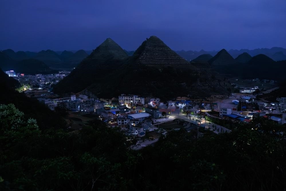 這是在夜色中拍攝的安龍縣郊外形狀酷似金字塔的山體(無(wú)人機(jī)照片,5月14日攝)。新華社記者 劉續(xù) 攝