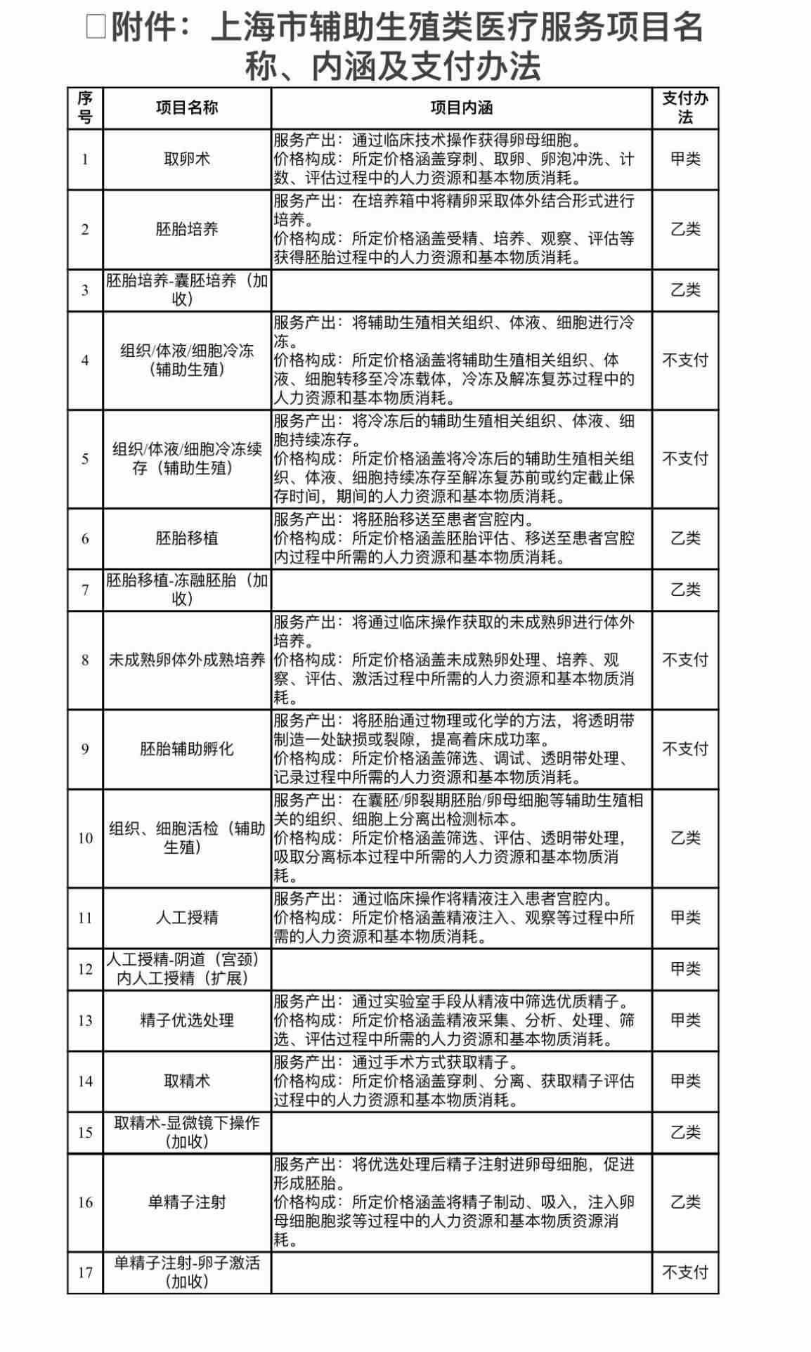 上海市醫(yī)保局:根據(jù)此次發(fā)布的文件,上海輔助生殖類醫(yī)療服務(wù)項目中17個,有5個不被納入醫(yī)保支付范圍,其中包括1、組織/體液/細胞冷凍(輔助生殖);2、組織/體液/細胞冷凍續(xù)存(輔助生殖);3、胚胎輔助孵化;4、未成熟卵體外成熟培養(yǎng)、5、單精子注射-卵子激活(加收)。