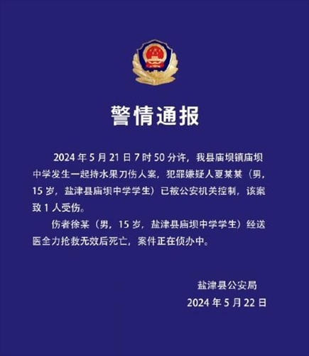 ·云南鹽津公安通報(bào)一中學(xué)發(fā)生持水果刀傷人案:嫌疑人已被控制,一人搶救無效死亡。