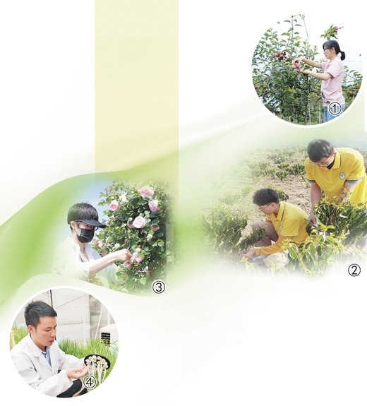 圖①:劉丹丹在調查蘋果病害情況。 圖②:咖啡團隊的學生們在咖啡田地里進行花芽分化調查。 圖③:周寧寧在進行月季雜交授粉。 圖④:雷貴杰在觀察水稻根系的生長狀況。以上圖片均為受訪者提供
