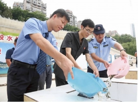 近日,梧州市龍圩區(qū)人民法院聯(lián)合區(qū)人民檢察院、梧州市農(nóng)業(yè)綜合行政執(zhí)法支隊(duì)漁政大隊(duì),在西江梧州段水生生物放流平臺(tái)增殖放流魚苗。