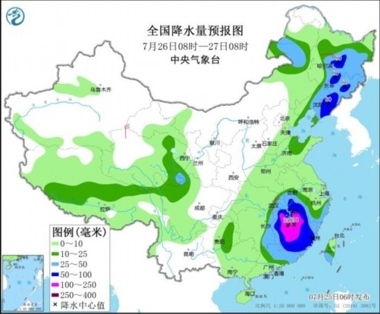 7月25日08時至26日08時,內(nèi)蒙古東部、吉林、遼寧、天津、河北東部、河南北部、山東北部、浙江南部、福建、廣東東部、臺灣島等地部分地區(qū)有大到暴雨,其中,內(nèi)蒙古東南部、遼寧中西部、河北東北部、山東北部、浙江南部、福建東部、廣東東南部、臺灣島大部等地部分地區(qū)有大暴雨,福建東北部、臺灣島中南部等地局地特大暴雨(250~500毫米)。