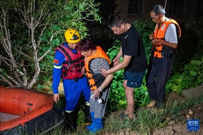 凌晨2時許,記者在決口現(xiàn)場看到,由于道路狹窄,通行不便,消防隊員扛著救生艇向受災區(qū)域挺進,不斷有受災群眾乘坐救生艇被轉(zhuǎn)移至安全地帶。