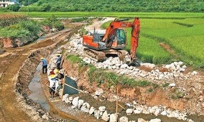 7月26日,湖南省洪江市巖垅鄉(xiāng)竹坪垅村,施工人員加緊修復(fù)被洪水沖毀的溪邊農(nóng)田保坎。楊錫建攝(人民視覺)