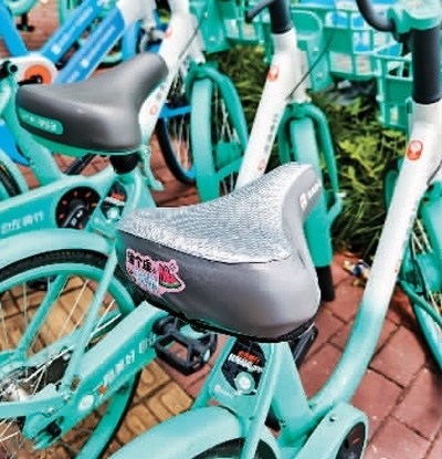 為了應對炎熱天氣,上海街頭一些共享單車換上了“清涼坐墊”。王 初攝(人民視覺)