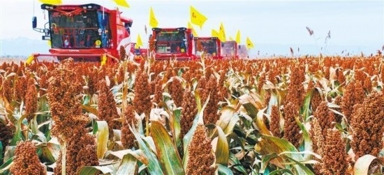 10月16日,甘肅省張掖市民樂(lè)縣有機(jī)紅高粱種植基地,大型收割機(jī)在收割高粱。王 將攝(中經(jīng)視覺(jué))