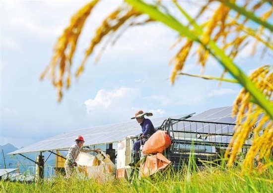 10月15日,浙江省樂(lè)清市勝利塘內(nèi)的“農(nóng)光互補(bǔ)”光伏發(fā)電項(xiàng)目基地,農(nóng)戶將收割好的稻谷裝袋。蔡寬元攝(中經(jīng)視覺(jué))