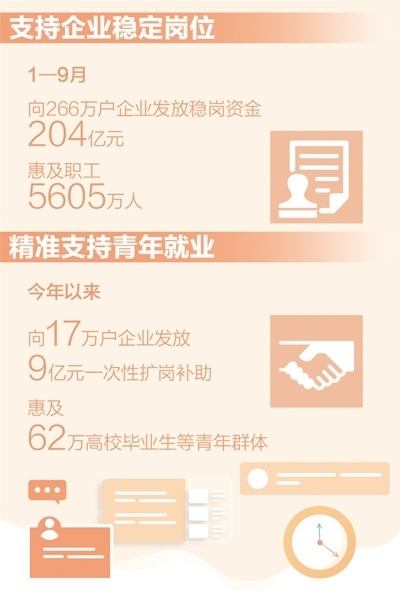 二是繼續(xù)對不裁員少裁員的參保企業(yè)實施穩(wěn)崗返還政策。擴大資金使用范圍,在現(xiàn)行職工生活補助、繳納社會保險費、轉(zhuǎn)崗培訓、技能提升培訓等穩(wěn)定就業(yè)崗位支出的基礎(chǔ)上,新增降低生產(chǎn)經(jīng)營成本支出,進一步支持企業(yè)發(fā)展。1—9月,各地通過“免申即享”的方式,向266萬戶企業(yè)發(fā)放穩(wěn)崗資金204億元,惠及職工5605萬人,有效支持企業(yè)穩(wěn)定就業(yè)崗位。