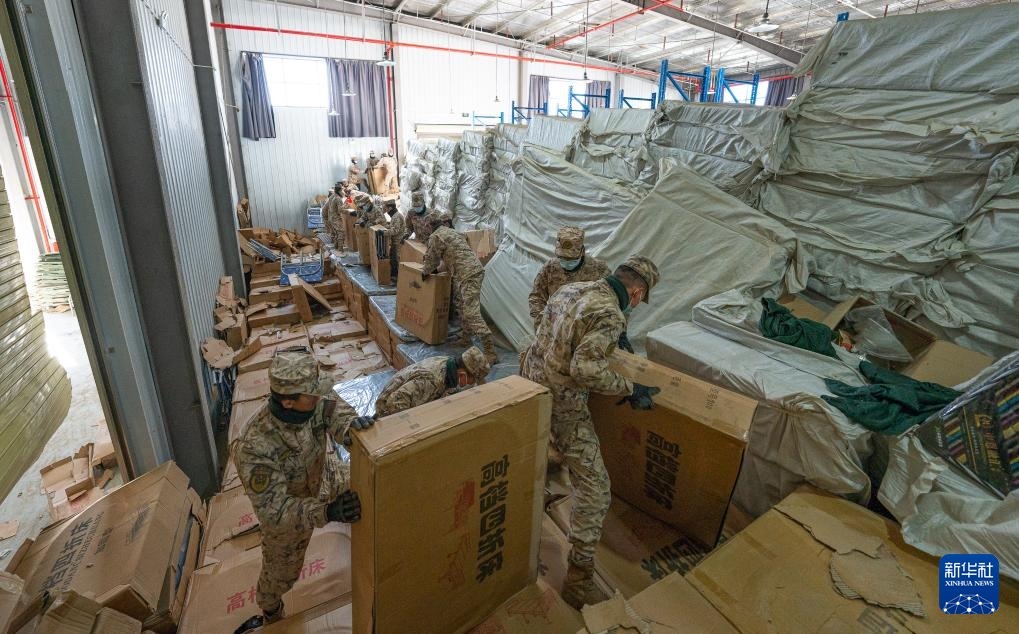 1月8日,在日喀則市經(jīng)開(kāi)區(qū)物資儲(chǔ)備倉(cāng)庫(kù),武警官兵在搬運(yùn)抗震救災(zāi)物資。