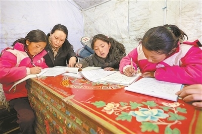 西藏自治區(qū)日喀則市薩迦縣普村的安置點內(nèi),黨員次央(左二)在輔導村里的小朋友寫作業(yè)。