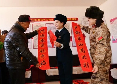 遼寧省朝陽市龍城區(qū)聯(lián)合鎮(zhèn)長立哈達村,朝陽軍分區(qū)官兵給幫扶老年人送春聯(lián)。