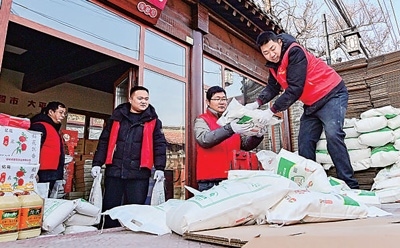 河北省秦皇島市海港區(qū)文化路街道團結(jié)里社區(qū),志愿者在整理捐贈給困難群眾的生活用品。
