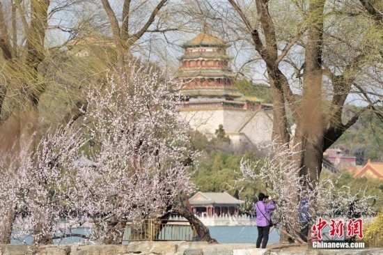 3月17日,游客在北京頤和園西堤賞花。近日,北京頤和園西堤山桃花進入最佳觀賞期,吸引眾多游客前往賞花。