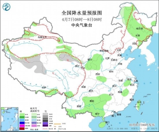 4月7日08時(shí)至8日08時(shí),新疆南疆西部和南部山區(qū)、內(nèi)蒙古東北部、黑龍江中北部、西藏西北部、青海北部等地部分地區(qū)有小雪或雨夾雪。新疆伊犁河谷、寧夏、陜西北部、黑龍江南部、吉林、云南南部、貴州中南部、廣西大部、湖南中西部、安徽南部、海南島、臺(tái)灣島等地部分地區(qū)有小雨,局地有中雨。內(nèi)蒙古大部、西藏北部、甘肅河西、川西高原北部等地部分地區(qū)有4~6級(jí)風(fēng),陣風(fēng)7級(jí)。