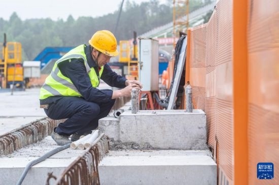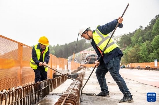 4月12日,工人在成渝中線高鐵玄天湖雙線大橋建設(shè)現(xiàn)場施工作業(yè)。
