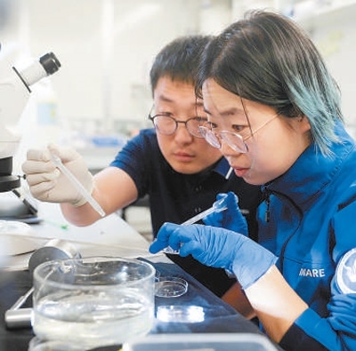 “雪龍2”號(hào)科考船上,考察隊(duì)員遲旭朋(左)和武佳星在船載實(shí)驗(yàn)室對南極浮游生物進(jìn)行分樣。