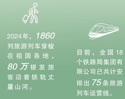 今年2月,商務(wù)部、文化和旅游部、中國國家鐵路集團(tuán)有限公司等9單位聯(lián)合發(fā)布《關(guān)于增開銀發(fā)旅游列車促進(jìn)服務(wù)消費(fèi)發(fā)展的行動計(jì)劃》,指出要擴(kuò)容旅游列車線路和產(chǎn)品,豐富銀發(fā)旅游列車產(chǎn)品供給,建立品質(zhì)型、舒適型、普惠型產(chǎn)品體系。目前,全國18個(gè)鐵路局集團(tuán)有限公司已共計(jì)安排出75條旅游列車運(yùn)營線。一趟趟銀發(fā)列車如春日繁花次第綻放,為老年人鋪就通往詩與遠(yuǎn)方的旅途,更以流動的風(fēng)景線激活沿線文旅消費(fèi),為推動經(jīng)濟(jì)高質(zhì)量發(fā)展注入“銀發(fā)”新動能。