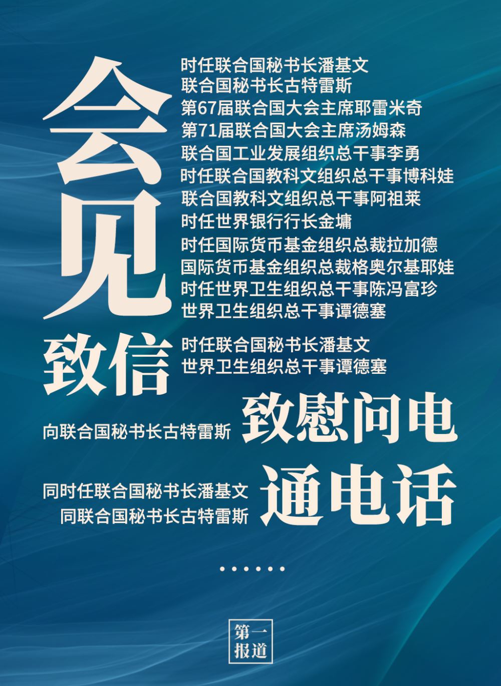 2013年以來,習(xí)主席通過會見、通話、致信函等多種方式同聯(lián)合國主要官員保持密切溝通?;訉ο蟀?lián)合國秘書長、聯(lián)合國大會主席,還有聯(lián)合國工業(yè)發(fā)展組織、聯(lián)合國教科文組織、世界銀行、國際貨幣基金組織、世界衛(wèi)生組織等聯(lián)合國專門機(jī)構(gòu)主要負(fù)責(zé)人。