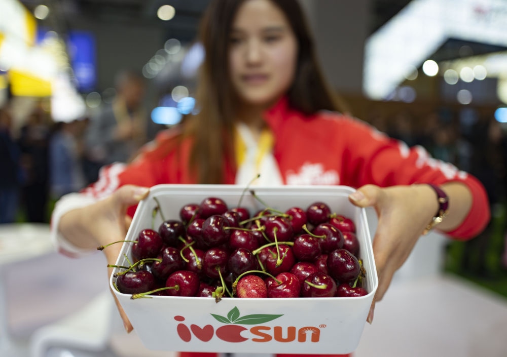 ▲第二屆進博會上,工作人員在食品及農(nóng)產(chǎn)品展區(qū)展示智利車厘子。
