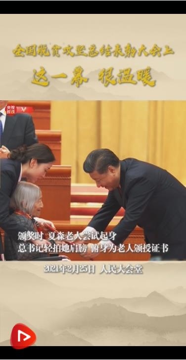 另一位坐輪椅領(lǐng)獎(jiǎng)的是98歲高齡的夏森老人,同樣心系貧困地區(qū)教育事業(yè)。她設(shè)立的“夏森助學(xué)金”已幫助180余名貧困生圓夢(mèng)大學(xué)。頒獎(jiǎng)當(dāng)天有一個(gè)細(xì)節(jié),夏森老人嘗試從輪椅起身致意,總書(shū)記輕拍她的肩膀,俯身為她頒獎(jiǎng)。