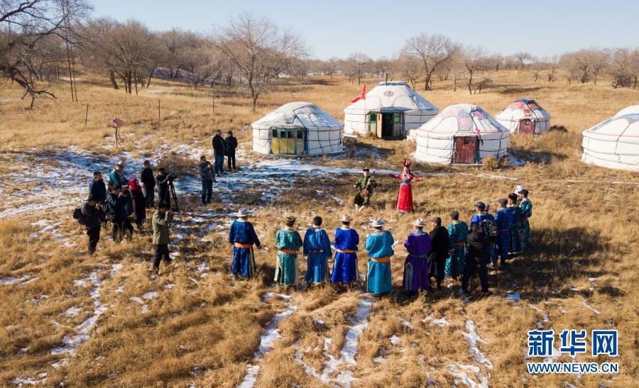 2018年11月9日,內(nèi)蒙古自治區(qū)錫林郭勒盟烏蘭牧騎隊(duì)員來到西烏珠穆沁旗烏蘭哈拉嘎蘇木新高勒嘎查的黨員中心戶恩克巴雅爾家,在戶外為周邊牧民表演節(jié)目(無人機(jī)照片)。新華社記者 彭源 攝
