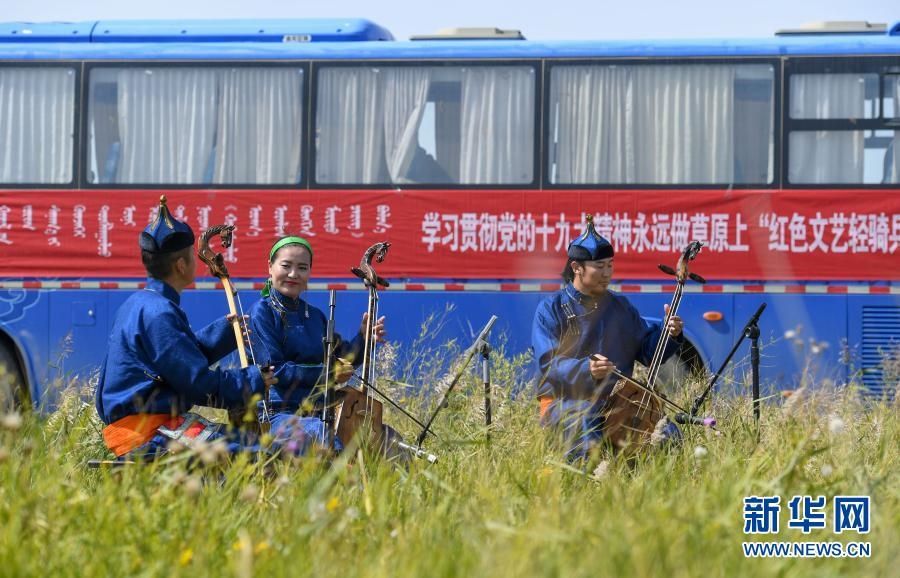 2018年9月13日,在內(nèi)蒙古自治區(qū)錫林郭勒盟鑲黃旗寶格達(dá)音高勒蘇木浩尼欽哈夏圖嘎查的一處草場(chǎng),鑲黃旗烏蘭牧騎的隊(duì)員在為牧民表演文藝節(jié)目。新華社記者 彭源 攝