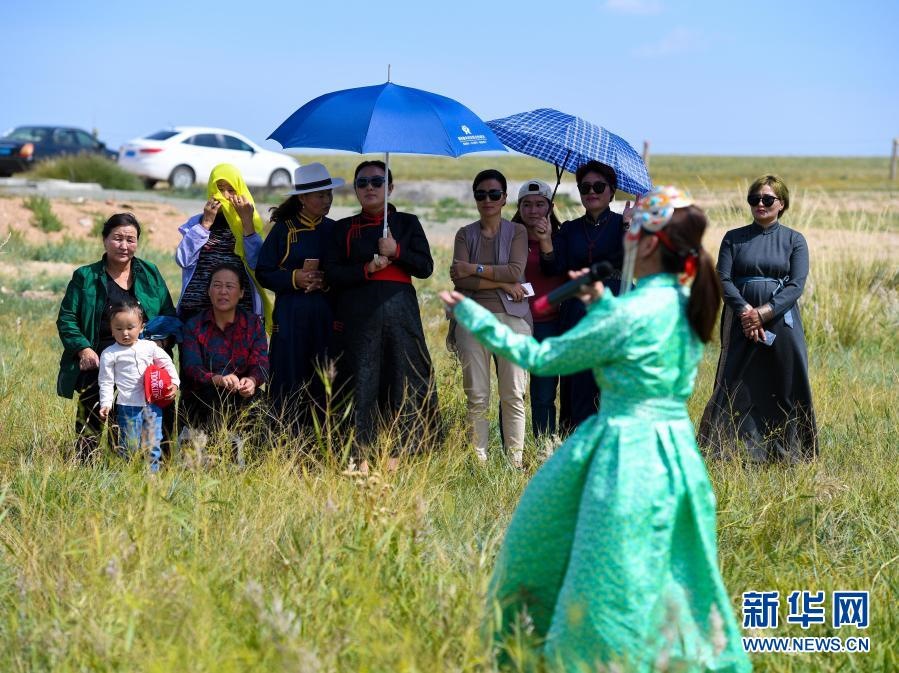 2018年9月13日,在內(nèi)蒙古自治區(qū)錫林郭勒盟鑲黃旗寶格達(dá)音高勒蘇木浩尼欽哈夏圖嘎查的一處草場(chǎng),鑲黃旗烏蘭牧騎的隊(duì)員在為牧民表演文藝節(jié)目。新華社記者