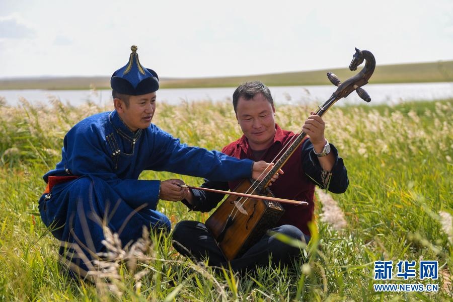 2018年9月13日,在內(nèi)蒙古自治區(qū)錫林郭勒盟鑲黃旗寶格達(dá)音高勒蘇木浩尼欽哈夏圖嘎查的一處草場(chǎng),鑲黃旗烏蘭牧騎的隊(duì)員在為牧民演奏馬頭琴。新華社記者