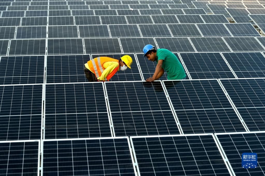 2021年1月3日,在位于孟加拉國首都達卡郊區(qū)的利德成集團廠區(qū),工人們在房頂組裝光伏模組。從2020年開始,中資制衣類企業(yè)——利德成集團在其位于孟加拉國達卡的廠區(qū)內建設光伏電站,以降低對傳統(tǒng)能源的依賴,減少碳排放,從綠色發(fā)展的角度助力“一帶一路”建設。新華社發(fā)