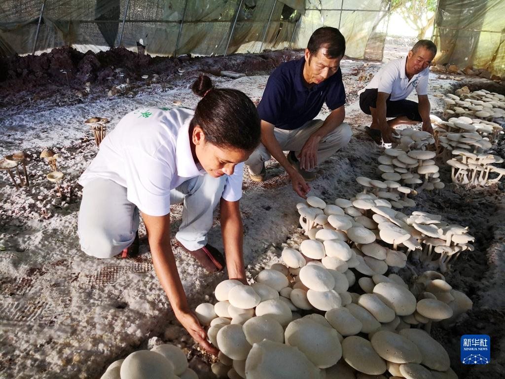 2018年6月12日,在斐濟楠迪,中國專家和當地雇員檢查菌菇生長情況。新華社記者張永興攝