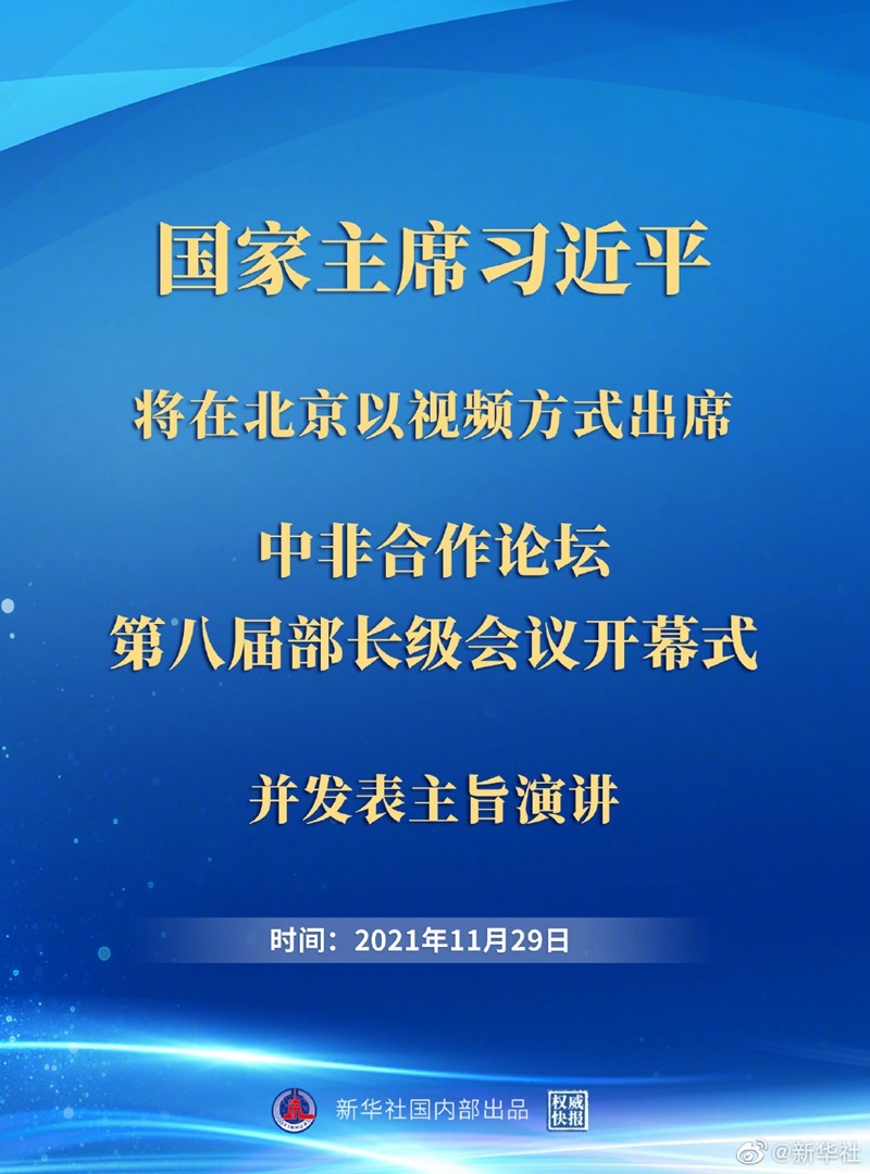 新華社北京11月26日電 外交部發(fā)言人華春瑩26日宣布:國家主席習(xí)近平將于11月29日在北京以視頻方式出席中非合作論壇第八屆部長級會議開幕式并發(fā)表主旨演講。
